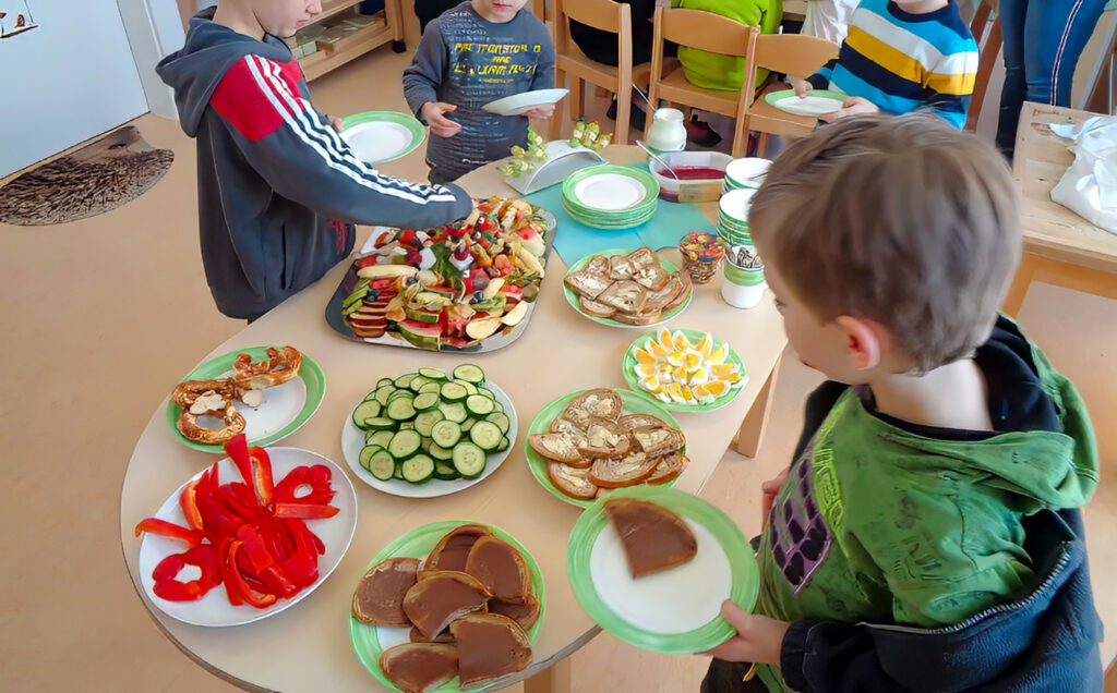 Über den Tag verteilt essen wir gemeinsam. Nach dem Morgenkreis isst jedes Kind seine mitgebrachte Brotzeit, ergänzt durch Obst und Gemüse. Um 12 Uhr folgt dann ein Mittagessen, das wir am wöchentlichen Kochtag mit den Kindern zusammen zubereiten.