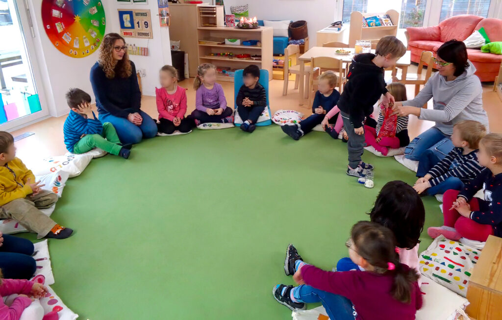 Im Morgenkreis kommen die Kinder zusammen und tauschen sich über Erlebnisse aus. Mit dazu gehören Kreisspiele, Lieder und Geschichten. Bei der persönlichen Begrüßung untereinander achten wir auf unterschiedliche Kulturen und Rituale. Anschließend wird der Kalender mit Wetter, Wochentag, Datum, Monat und Jahreszeit gestaltet. Im letzten Teil besprechen wir gemeinsam die Pläne für den Tag.